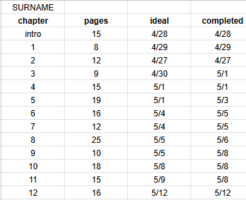 I now do what I imagine some editors do right away: I go through the manuscript and note how long each chapter is, recording the page numbers (or word counts) into an Excel sheet as I go. Then I look at my calendar and make a tentative schedule for the project.